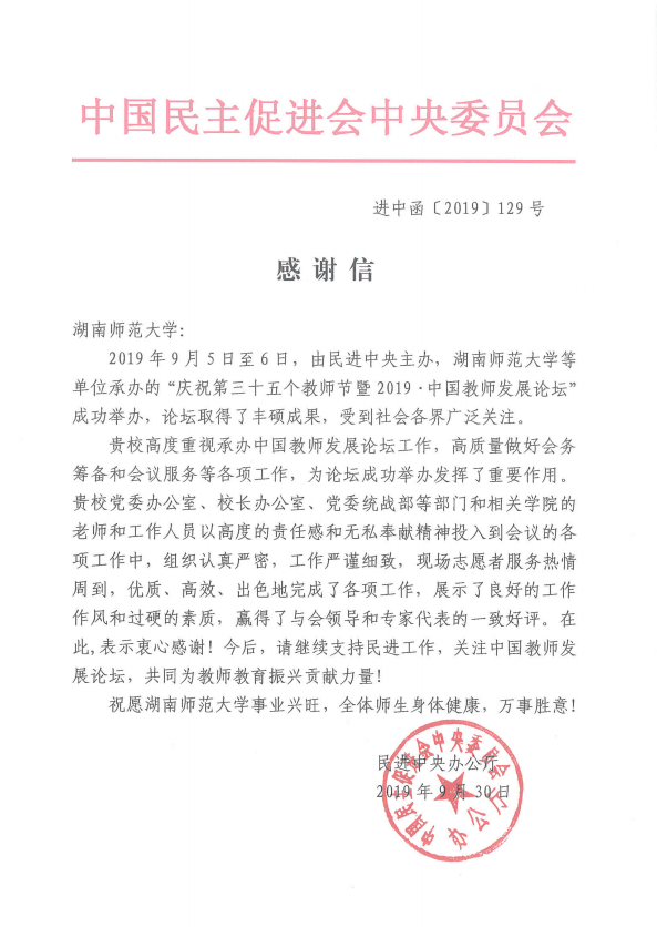 (通讯员 刘丽娟)近日,中国民主促进会中央委员会向我校发来感谢信,对我校在“庆祝第三十五个教师节暨2019·中国教师发展论坛”中的承办工作给予了充分肯定。