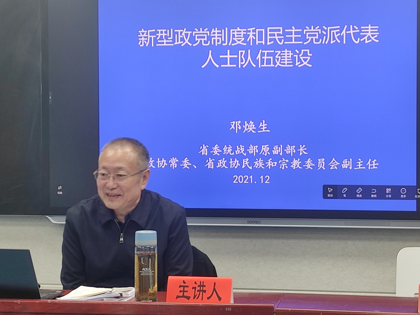 邓焕生主任聚焦于新型政党制度,从五个方面阐述加强新时代民主党派代表人士队伍建设的时代背景、重要意义、主要方面和具体举措:从民主党派历史和现状出发明确各民主党派是我国新型政党制度中的参政党;从利益代表、力量整合和治理效果三个维度深化对新型政党制度“三新”的理解;从我国优秀文化传统和多党合作历史出发深化对新型政党制度的中国特色的理解;从加强民主党派领导班子、组织队伍、履职能力建设等方面坚持好发展好完善好新型政党制度;采取切实有效措施搞好民主党派代表人士队伍建设。