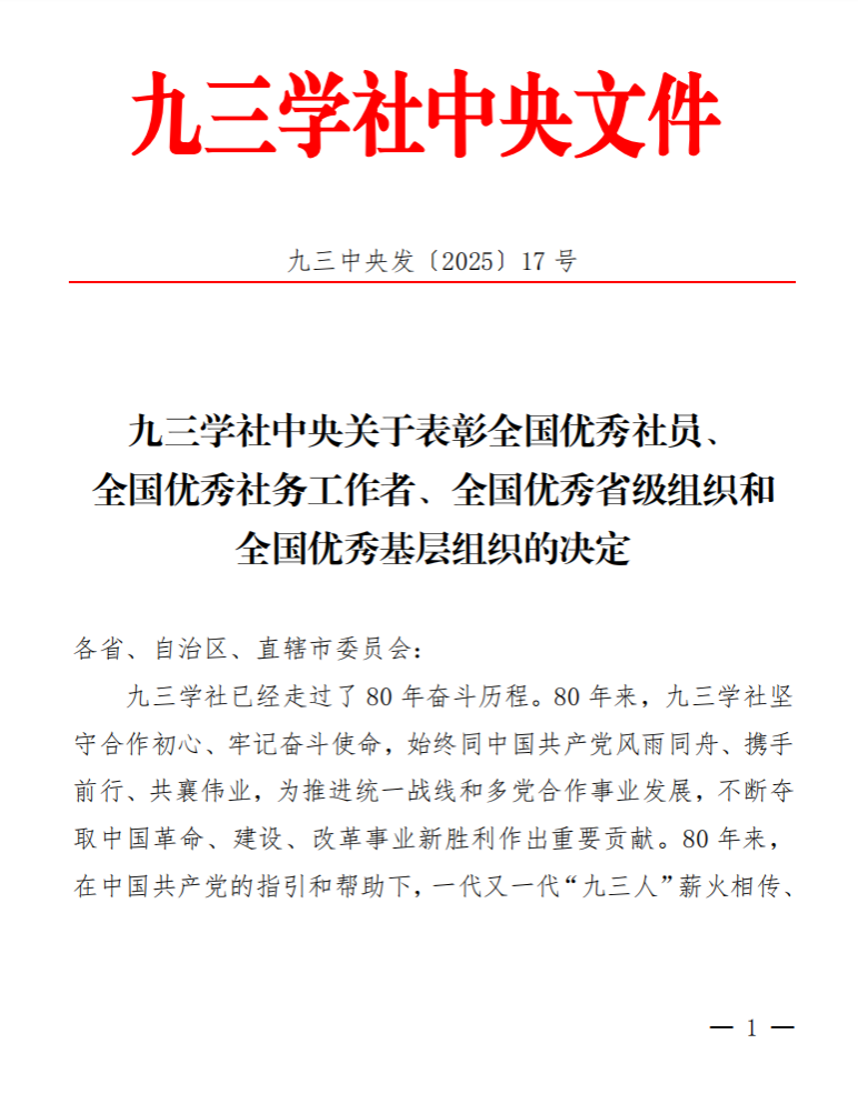 在庆祝九三学社创建80周年之际,为表彰先进典型、弘扬优良传统,激励广大社员及各级社组织积极投身中国特色社会主义事业建设,九三学社中央于近日发布《九三学社中央关于表彰全国优秀社员、全国优秀社务工作者、全国优秀省级组织和全国优秀基层组织的决定》(九三中央发〔2025〕17号)。其中,九三学社sunbet申搏委员会荣获“全国优秀基层组织”称号,委员会主委唐承丽教授获评“全国优秀社务工作者”。