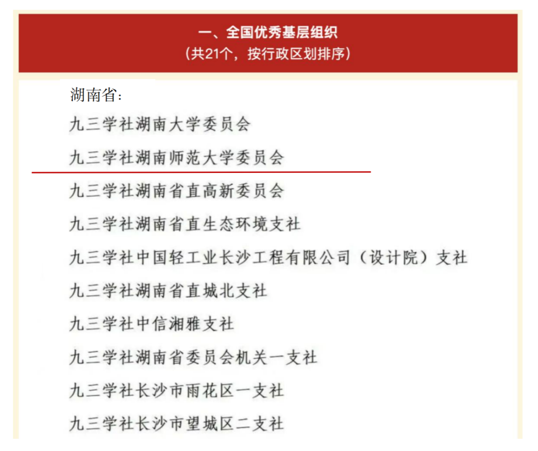 据统计,委员会多次获九三学社中央及湖南省委会表彰,包括“九三学社全国脱贫攻坚民主监督先进集体”“九三学社全国宣传思想工作先进单位”“九三学社优秀基层组织”等称号。委员会成员也屡获殊荣,涵盖省政协“优秀委员”“国家精准扶贫工作成效第三方评估先进个人”、长沙市“优秀政协委员”、九三学社湖南省信息工作优秀个人、中国科协“最美科技志愿者”、湖南省普通高校教学能手、湖南省课程思政教学名师、湖南省高校教育教学成果奖、全国高校教师教学创新大赛一等奖、全国妇幼健康科学技术二等奖等多项荣誉称号及奖项。